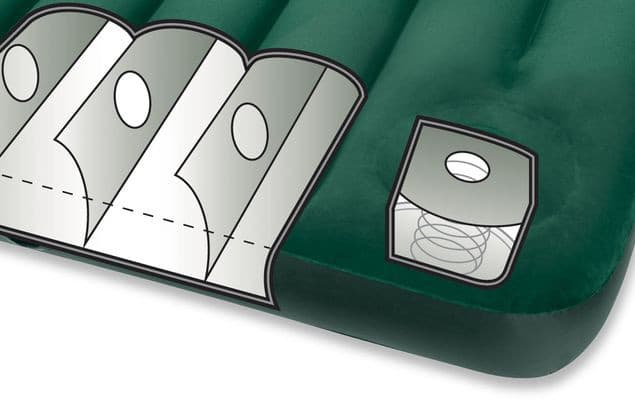 Двуспальный надувной матрас со встроенным ножным насосом. Цвет зеленый. Флокированное покрытие не даёт соскальзывать белью, и в тоже время легко чистится. Клапан 2-в-1 позволяет надуть матрас также и внешним насосом.